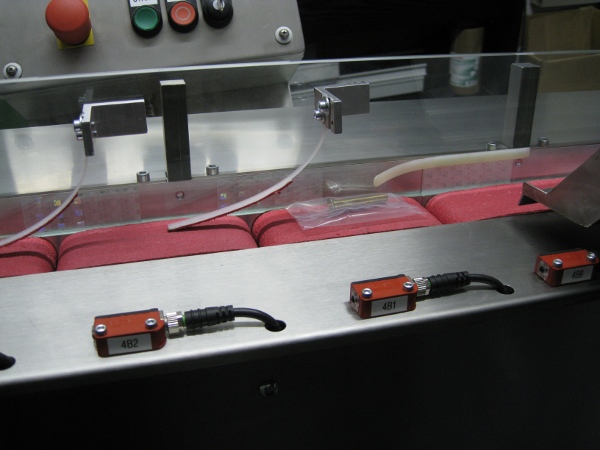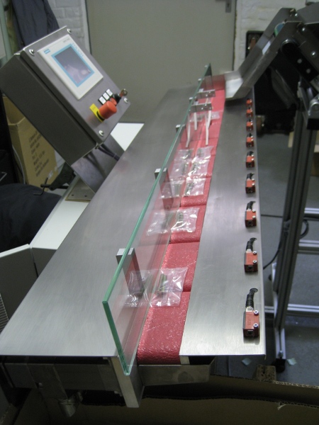 Schraubenbeutelvereinzelung. Diese Vereinzelung wird von einem Bunker mit Schraubenbeuteln versorg und mittels Sensoren und einzeln angesteuerten Transportbändern werden die Schraubenbeutel vereinzelt und auf einen gleichmäßigen Abstand gebracht. Somit wird sichergestellt das bei jedem Produkt nur ein Schraubenbeutel beigelegt wird. HOPPE gilt als Marktführer in der Entwicklung, Herstellung und Vermarktung von Beschlag-systemen für Türen und Fenster in Europa. Kernkompetenz ist die Großserien-Herstellung von qualitativ hochwertigen Beschlagsystemen. |